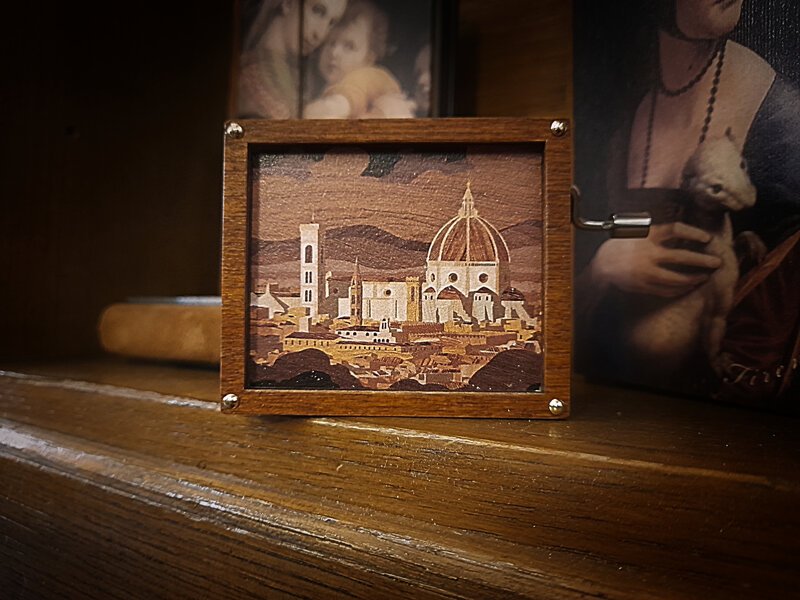 Wooden Manual Music-box with original printed image "Duomo Woodcarved". Internal manual music box with chrome lever, and brand stamp on the bottom (listen to music on Youtube)