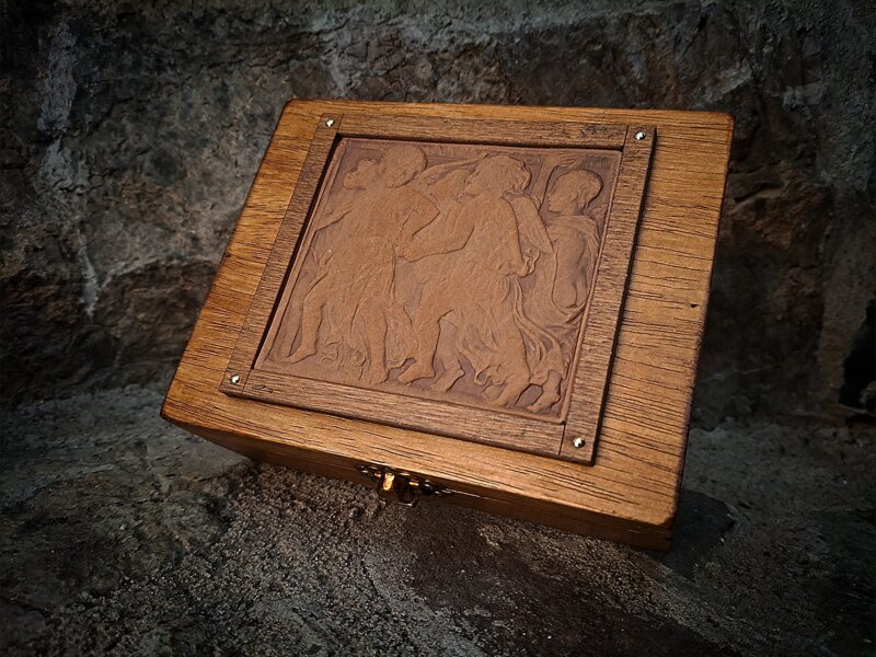 Scatola in legno di Tiglio con "Ballo della Farandola" di Donatello in pelle di vacchetta pressata a fuoco e incorniciata in legno, cordino di apertura e logo interno. Piccola pergamena per scrivere un pensiero, e certificato di lavorazione.