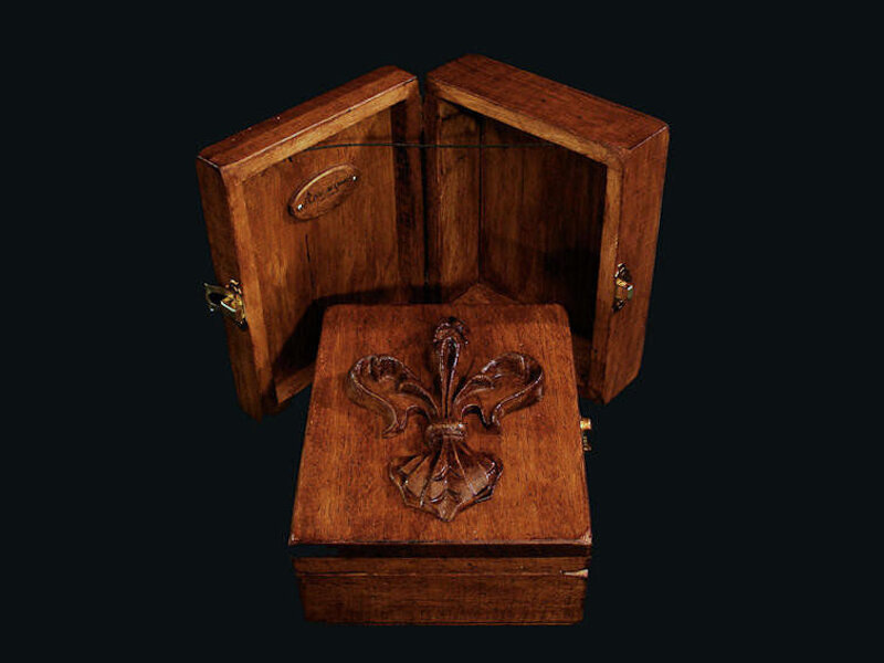 Linden wood box with symbol of Florence carved, opening cord and wooden logo. Inside small rolled parchment for gift ideas and construction certificate.