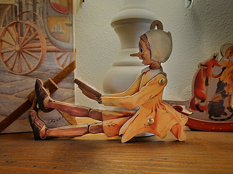 Wooden Pinocchio puppet, with mechanisms made in brass. Wood cut by fret and natural colours prints.