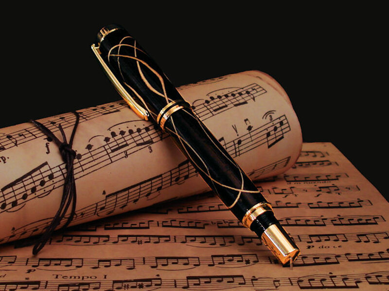 Penna Stilografica in legno tornito e intarsiato a mano in Wenge con filetto chiaro in Acero; Pennino in rodio placcato oro e parti metalliche placcate oro,