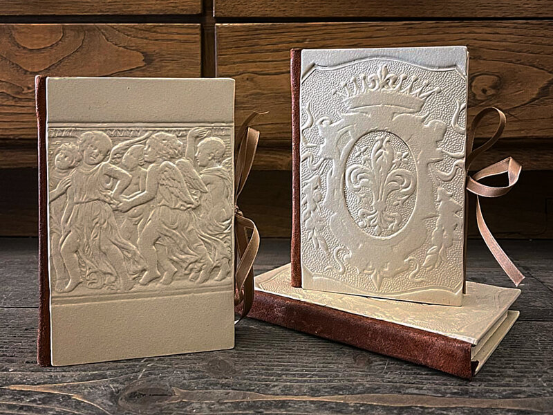 Quaderno con copertina in carta a rilievo pressata a freddo, costola in pelle, prima pagina interna decorata con Giglio di Firenze pressato a secco, filo esterno delle pagine tagliato a sega per creare un bellissimo effetto antico.