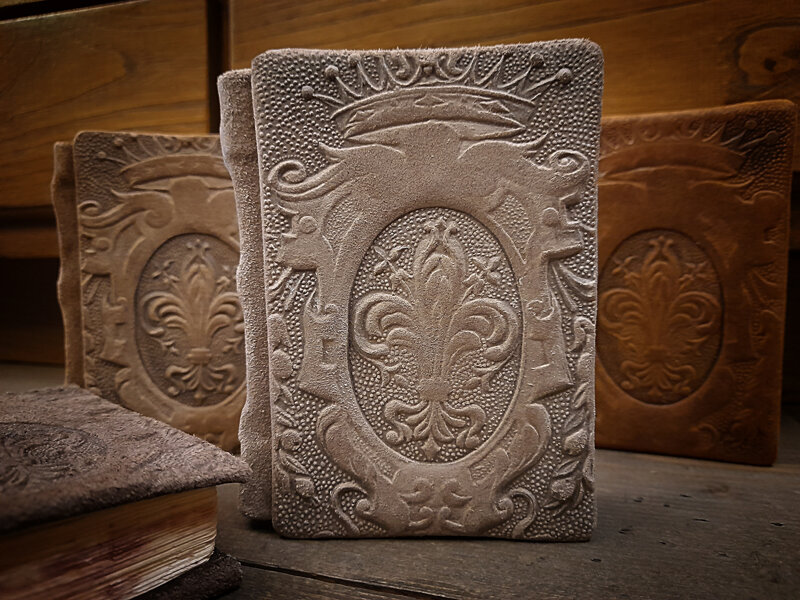 Quaderno in pelle di vacchetta con copertina rigida, decorazione con Giglio di Firenze pressato a caldo. Colori disponibili sempre diversi.