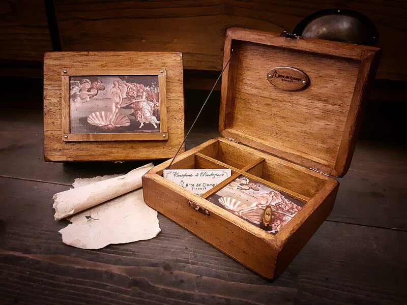 Music-box "Birth of Venus" by Botticelli . Music-box in Linden wood with "Birth of Venus" image, external frame, opening cord and wooden logo. Automatic hidden music box with "Greensleaves" music. (listen to the music on youtube)