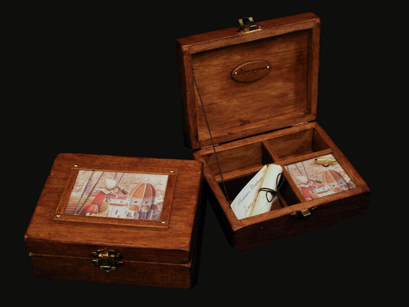 Music-box "Pinocchio in Air-Bolloon" . Music-box in Linden wood with image of the original "Pinocchio in Balloon" series, external frame, opening cord and wooden logo. Automatic internal music box with "Greensleaves" music. (listen to music on youtube)