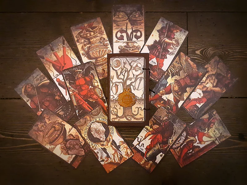 Tarot cards with reproductions of the "Sola Busca" collection, with rigid cardboard packaging and leather closures, and leather patches with Giglio and florentin Fiorino. Instructions and meaning of each card inside.